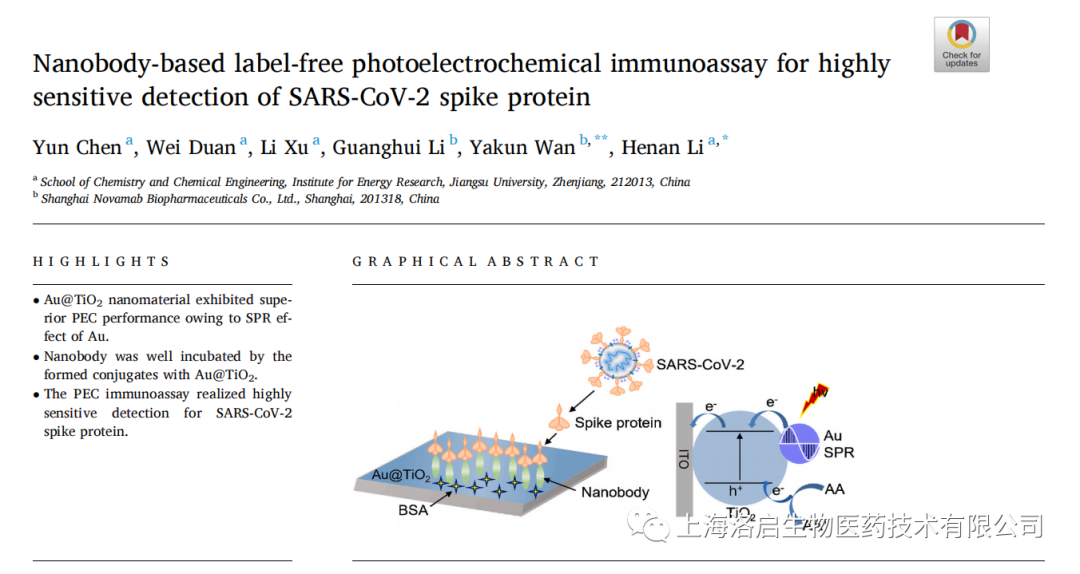 2022年5月3日,BG大游集团生物和江苏大学化学化工学院李赫楠教授团队合作,在《Analytica Chimica Acta》发表了题为“Nanobody-based label-free photoelectrochemical immunoassay for highly sensitive detection of SARS-CoV-2 spike protein”的研究论文。BG大游集团生物万亚坤博士和李贺楠教授为并列通讯作者,相关纳米抗体的知识产权归BG大游集团生物所有。